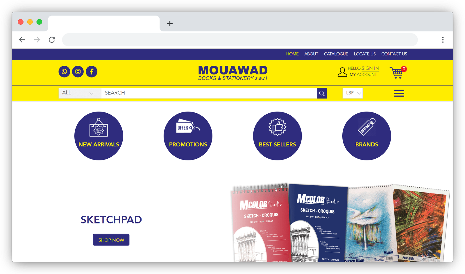 Mouawad Books & Stationery traces its origins back to 1964 in Gemmayze, Lebanon, evolving into its current incarnation in Jal El Dib in 2000. The website presents a comprehensive catalogue of stationery and art-supply products — categories include fine art materials (paints, brushes), hobby & craft, adhesive products, sketchpads, bags, paper products, filing & books, and a “copy centre” offering.